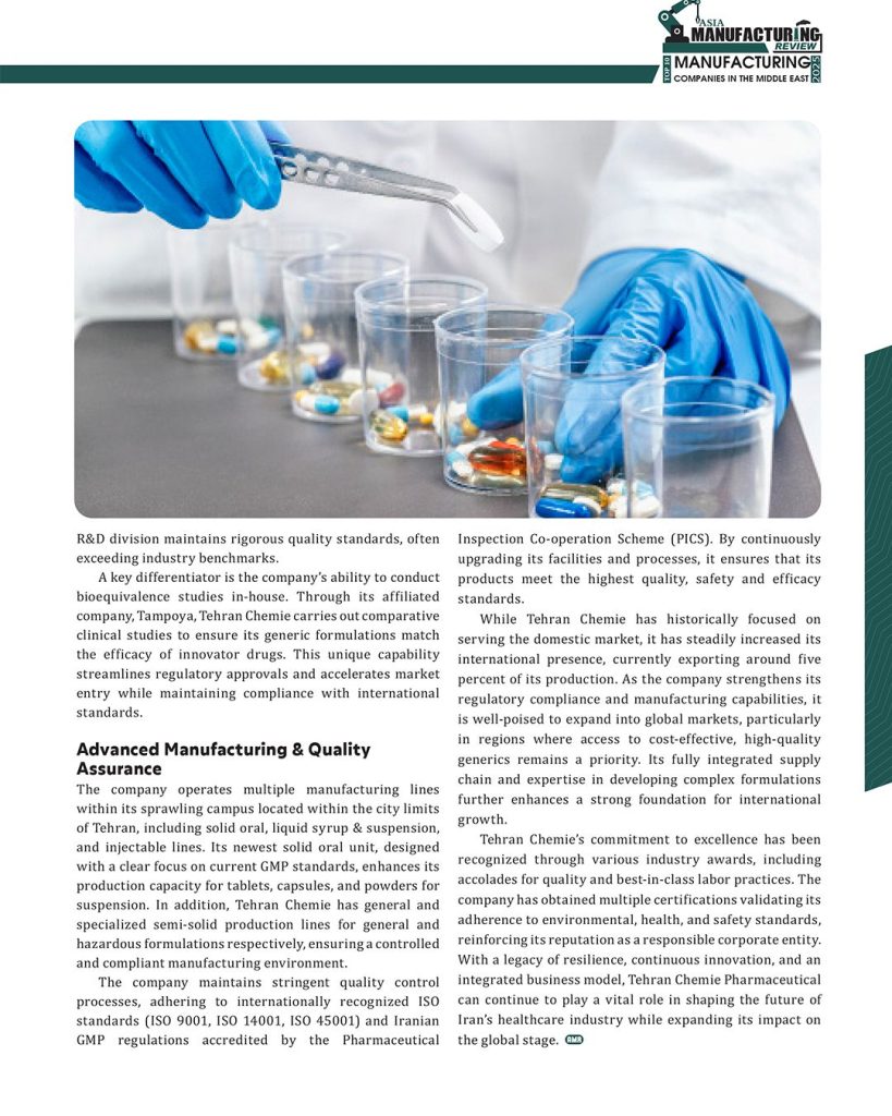 در این مجله، شرکت داروسازی تهرانشیمی (تولیدکننده متنوعترین سبد محصولی دارویی کشور) به عنوان تنها شرکت ایرانی این فهرست معرفی شده است.