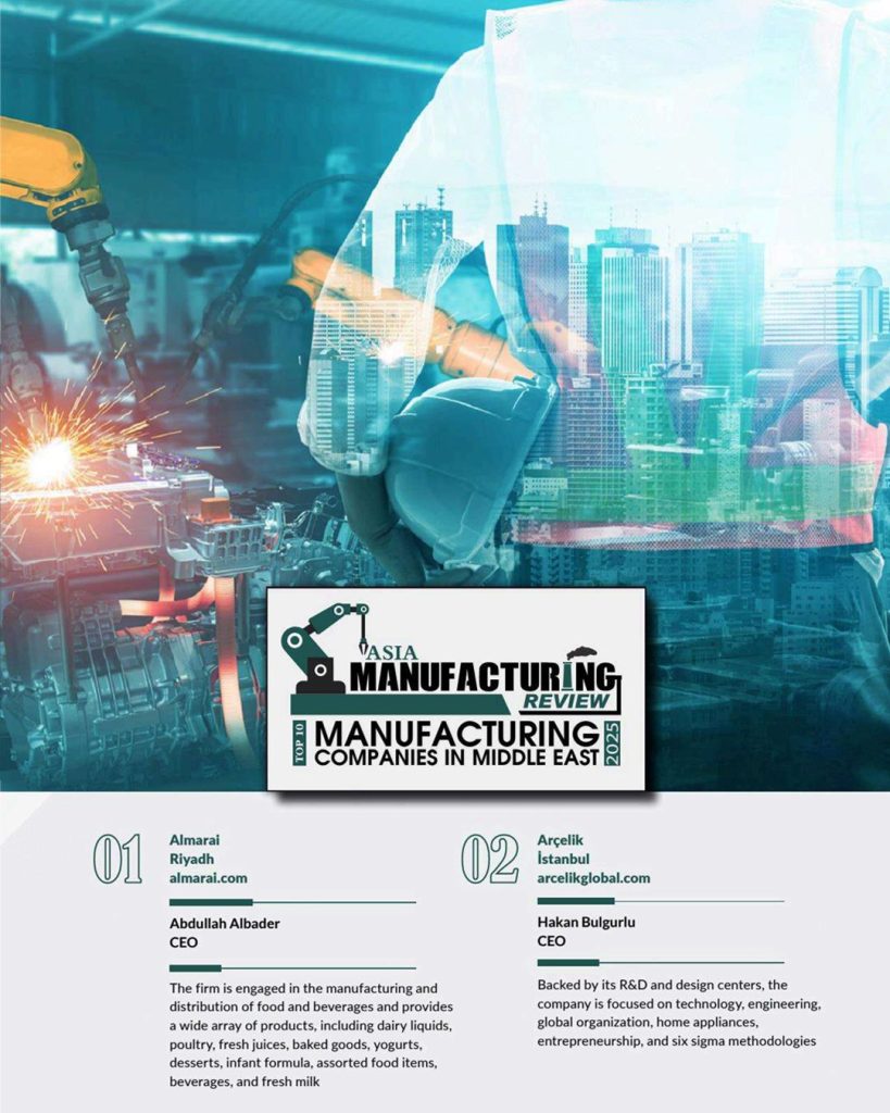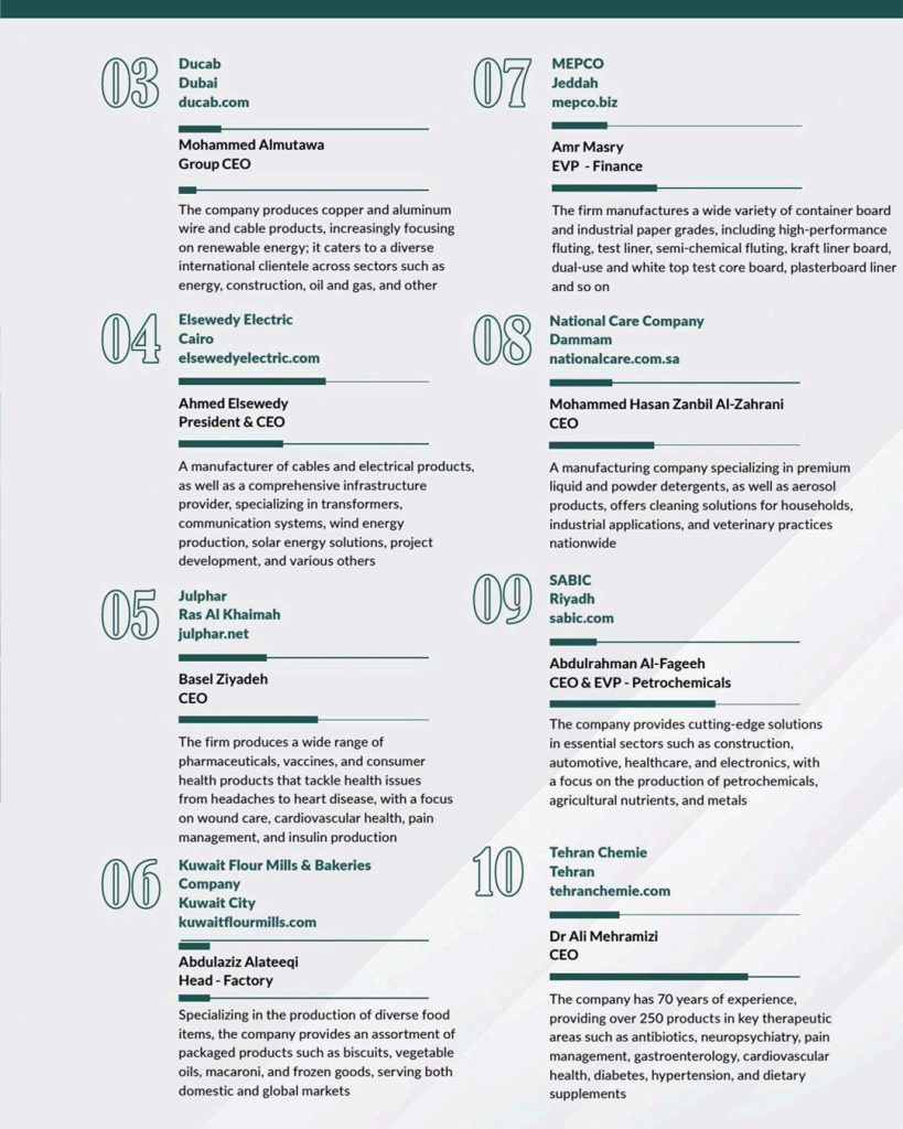 مجله ASIA MANUFACTURING REVIEW در جدیدترین شماره خود، با بررسی شرکتهای فعال در صنایع مختلف در منطقه خاورمیانه، فهرستی از ده شرکت برتر تولیدکننده را ارائه داد.